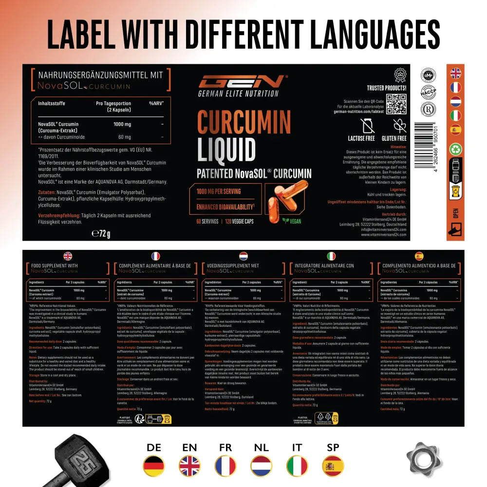 GEN Curcumin Liquid setzt auf das patentierte NovaSOL®-System, das Curcumin in flüssiger Mizellenform bereitstellt. Damit erreichst du eine deutlich erhöhte Bioverfügbarkeit im Vergleich zu herkömmlichen Curcumin-Pulvern. Pro Portion (2 Kapseln) erhältst du 1000 mg NovaSOL® Curcumin, davon 60 mg Curcuminoide – vegan, hochdosiert und klar deklariert.