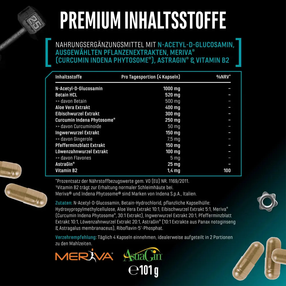 Zutaten: N-Acetyl-D-Glucosamin, Betain-Hydrochlorid, Überzugsmittel: Hydroxypropylmethylcellulose (pflanzlich) (pflanzlich), Aloe Vera Extrakt 10:1, Eibischwurzel Extrakt 5:1, Meriva® (Curcumin Indena Phytosome®, 30:1 Extrakt), Ingwerwurzel Extrakt 20:1, Pfefferminzblatt Extrakt 10:1, Löwenzahnwurzel Extrakt 20:1, AstraGin® (10:1 Extrakte aus Panax notoginseng & Astragalus membranaceus), Riboflavin-5’-Phosphat.